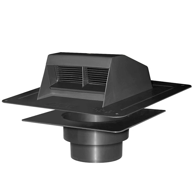 Canplas Duraflo(R) bathroom ventilation roof vent exhaust, with flapper and unattached collar. Made of black plastic and 12″ x 13″ x 3″ in size.