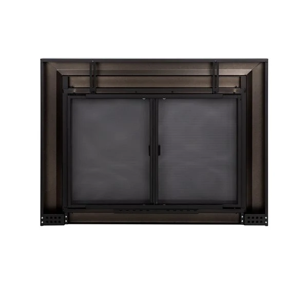 The Carlisle fireplace glass door is a decorative cabinet-style door with a high heat powder-coated finish which enhances a traditional masonry fireplace hearth. This one-piece frame construction is designed as a surface mount and sits outside the fireplace opening against a flat surface. The fireplace glass door assists in reducing heat loss or cool air loss up the chimney by as much as 90%. That equals a year-round energy savings when the fireplace is not in use. Comes with easy grip handles, hidden damper control knobs for air flow control and heat-resistant thick insulation. For masonry fireplaces only; not compatible with prefabricated. Made in the U.S.A.