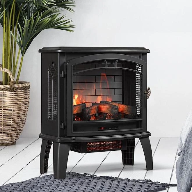 This Style Selections 5,200 BTU infrared quartz electric stove heater provides supplemental zone heating for up to 1,000 sq. ft. all with charming style. The patent pending 3D flame® effect technology offers the beauty of brilliant flames layered on and behind the logs for a truly realistic fire experience. Flame effects can be used with or without heat for year-round ambiance, and can also be customized with five brightness settings. In addition to an operable glass-front door, wire-mesh side panels allow you to enjoy even more of the brilliant fire. The infrared quartz heat warms your room quickly without reducing the natural humidity in the air, creating comfortable heat that won/t dry out the room/s air. Lastly, the unit has an adjustable thermostat with digital temperature read-out, a timer with automatic timed shut-off from 30 minutes up to 9 hours, and a convenient remote control.